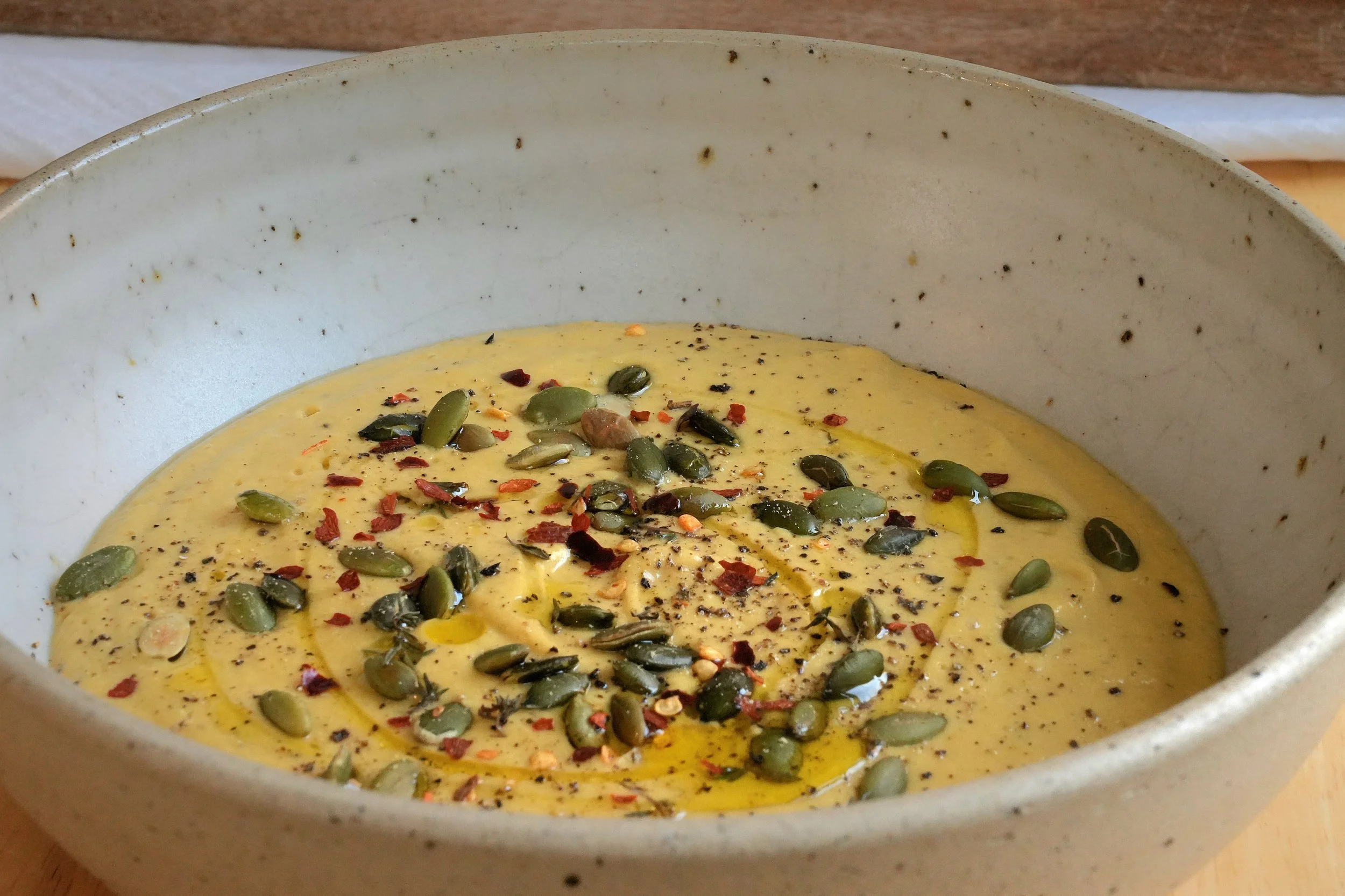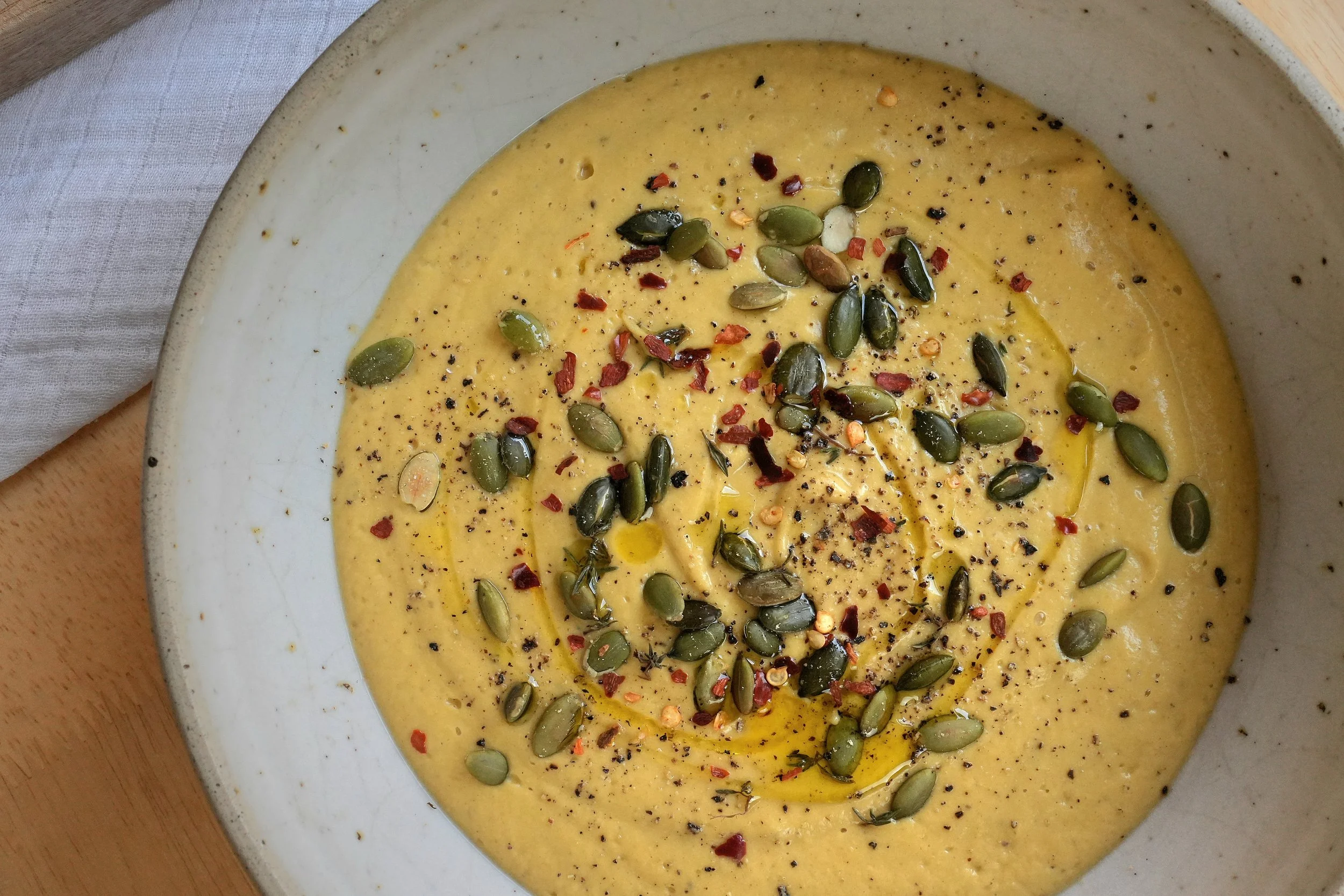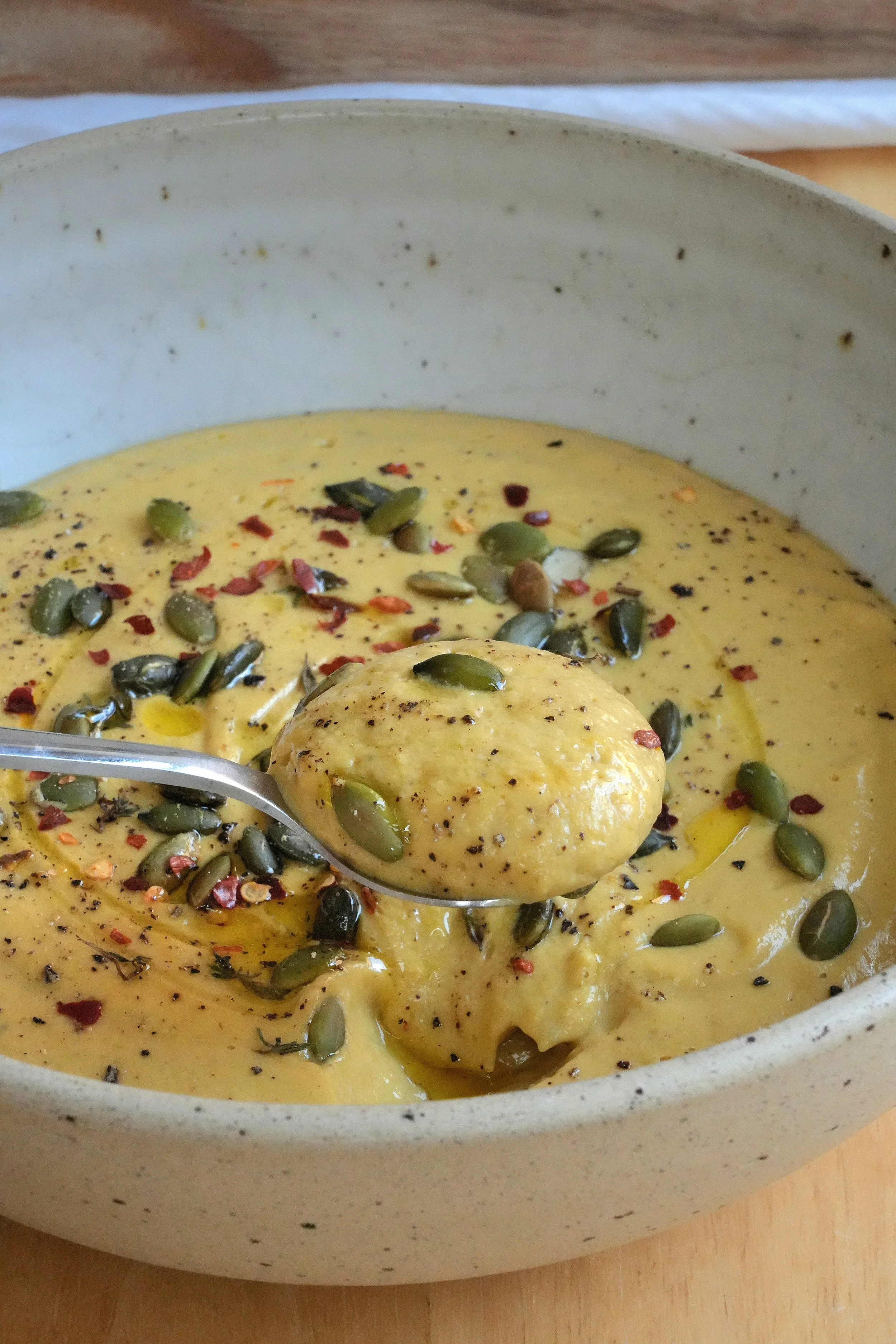 Serve with toasted pumpkin seeds, chilli flakes, olive oil drizzle — the crunchy-spicy finish makes it SO good!